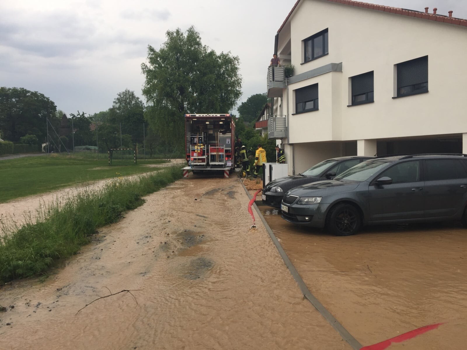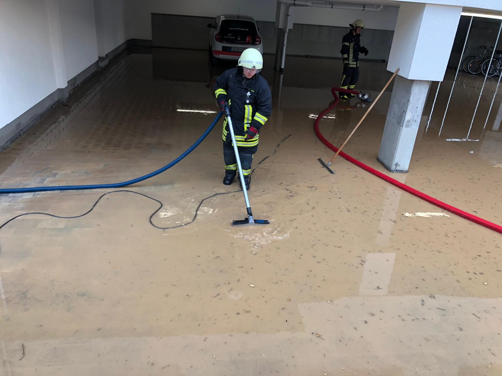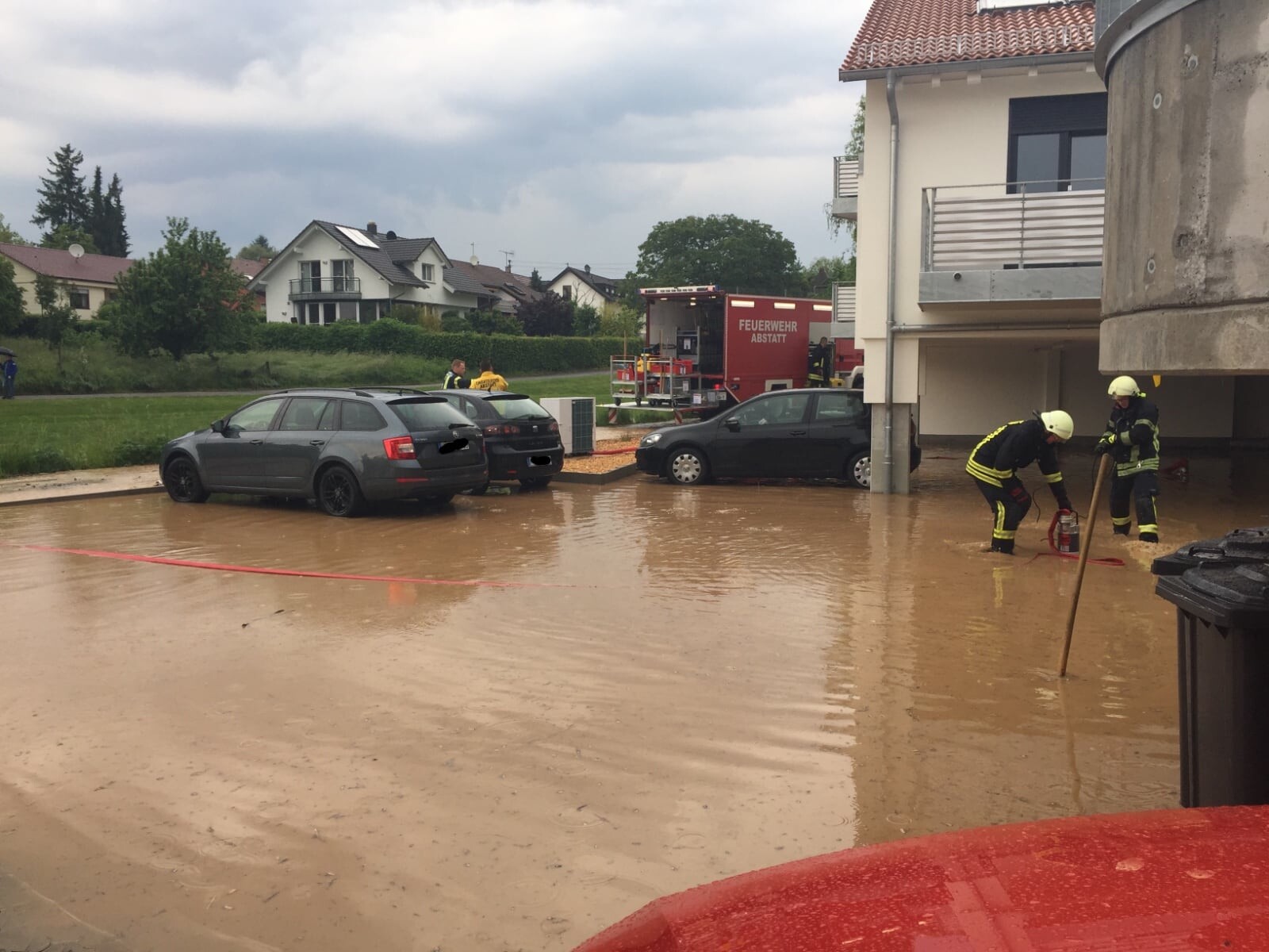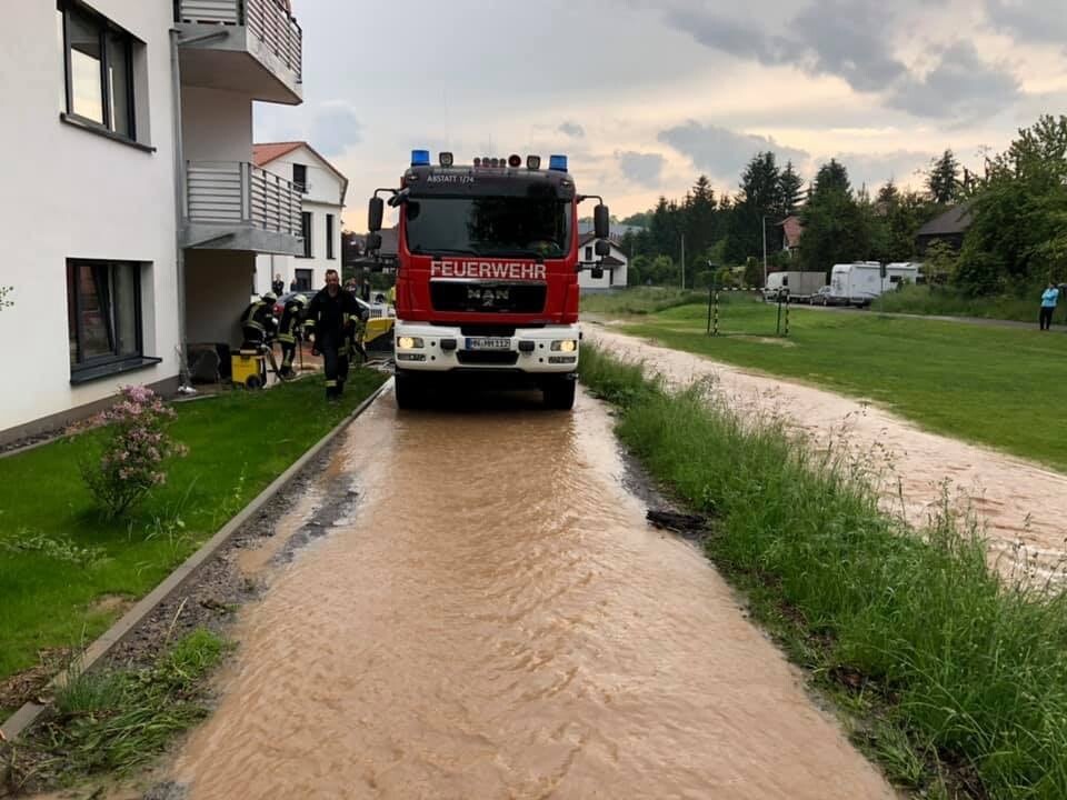 Am 25.05.2019 wurde die Feuerwehr Abstatt um 17:09 Uhr zu einem Unwettereinsatz in die Veilchenstraße nach Happenbach alarmiert. Dort kam es zur Überflutung eines Parkdecks. Die Feuerwehr Abstatt pumpte mit Hilfe von zwei Tauchpumpen das Wasser ab. Da das Hochwasser bei einem Gebäude bereits die Terassentüre erreicht hatte wurde ein Wassersauger zum aufnehmen des Wassers eingesetzt. Um eine weitere Überschwemmung des Parkdecks und der Terasse zu verhindern, wurde aus Sandsäcken ein Schutzwall errichtet.