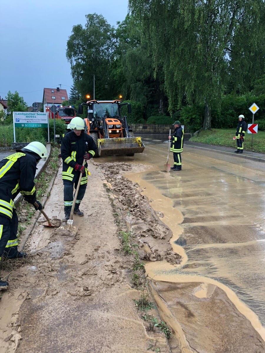 Die Feuerwehr Abstatt wurde am 22.06.2019 um 18:21 Uhr auf die L1111 nach Happenbach alarmiert. Dort war die Fahrbahn in Fahrtrichtung Unterheinriet auf Grund des Unwetters, vom Schlamm der benachbarten Äcker, nicht mehr befahrbar. Die Feuerwehr Abstatt sicherte zum Schutz der Verkehrsteilnehmer die Straße ab. Mithilfe des Kommunal Traktors des Bauhofes wurde die Fahrbahn vom Schlamm befreit und anschließend mit einem C-Rohr gereinigt.