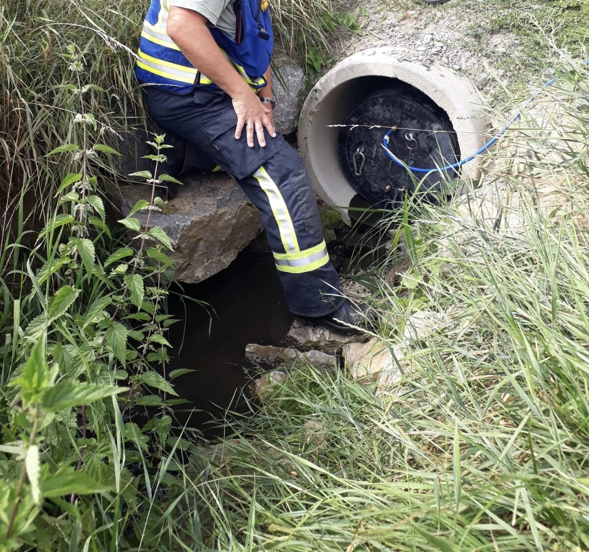 An der Einsatzstelle war Gärsubstrat, welches über einen Lohnunternehmer von einer Biogasanlage zu Düngezwecken bereitgestellt worden war, in Folge einer korrodierten Schweißnaht ausgetreten und in einen Wassergraben der in den Neckar führt eingelaufen.Um das Einlaufen des Gärsubstrates in den Neckar zu verhindern, wurde durch die Feuerwehr Abstatt an einem Durchlauf ein Rohrdichtkissen gesetzt.