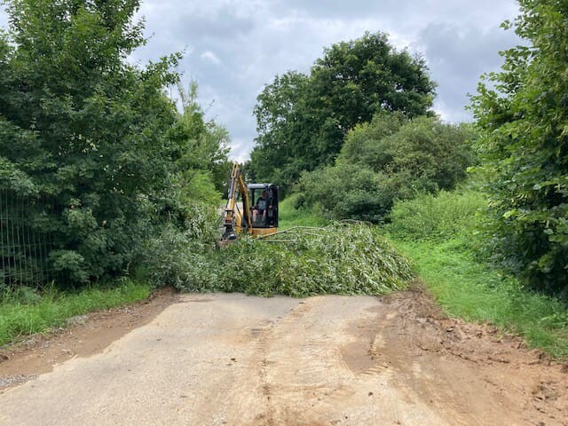 Telefonisch wurde mit dem Bauhofleiter die Lage besprochen. Der Bauhofleiter bot an, den Baum mit dem Bauhofbagger zu entfernen. Er benötigt hierfür lediglich zwei Kameraden zur Unterstützung, die für den Zeitraum der Arbeiten die Straße sperren und absichern.