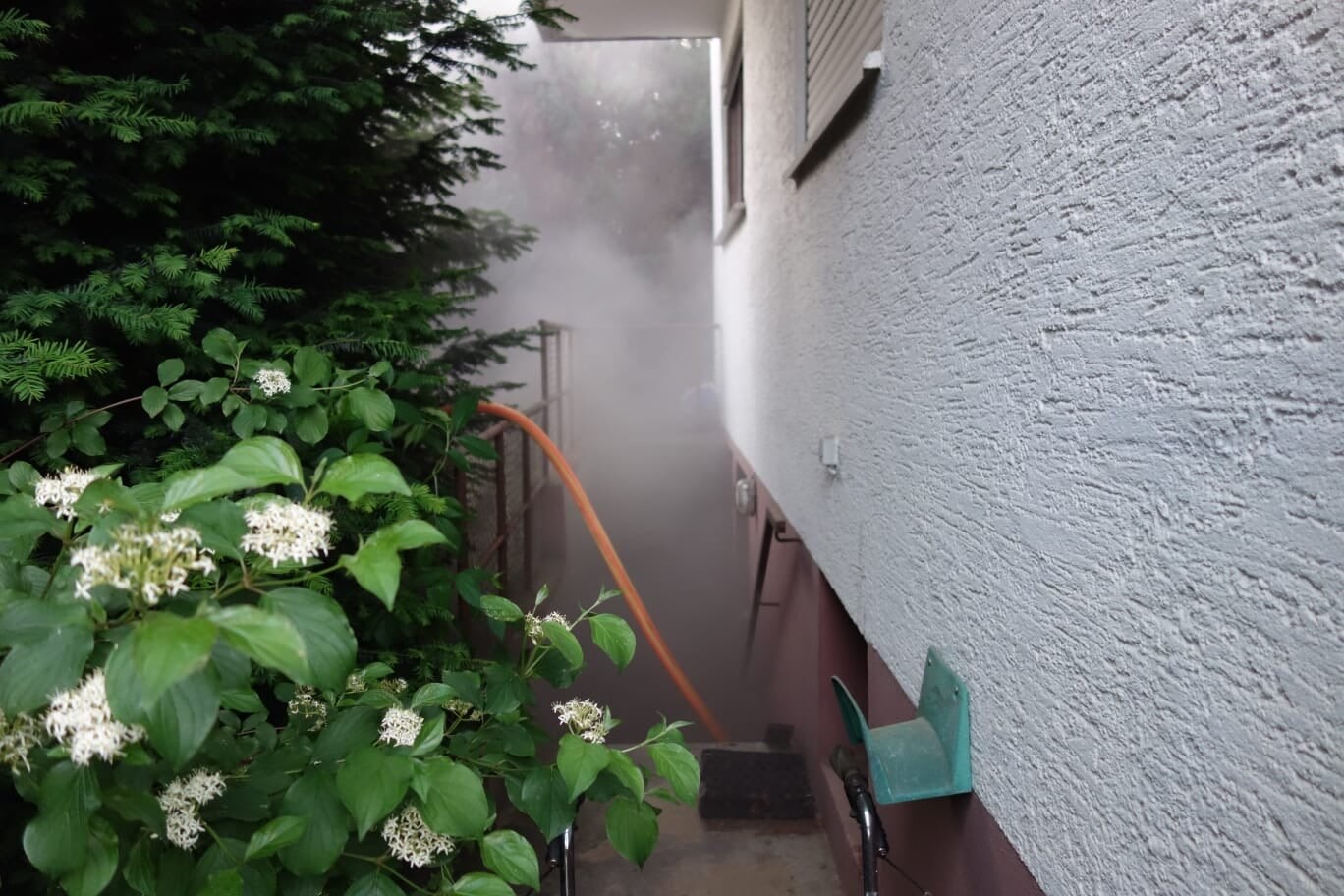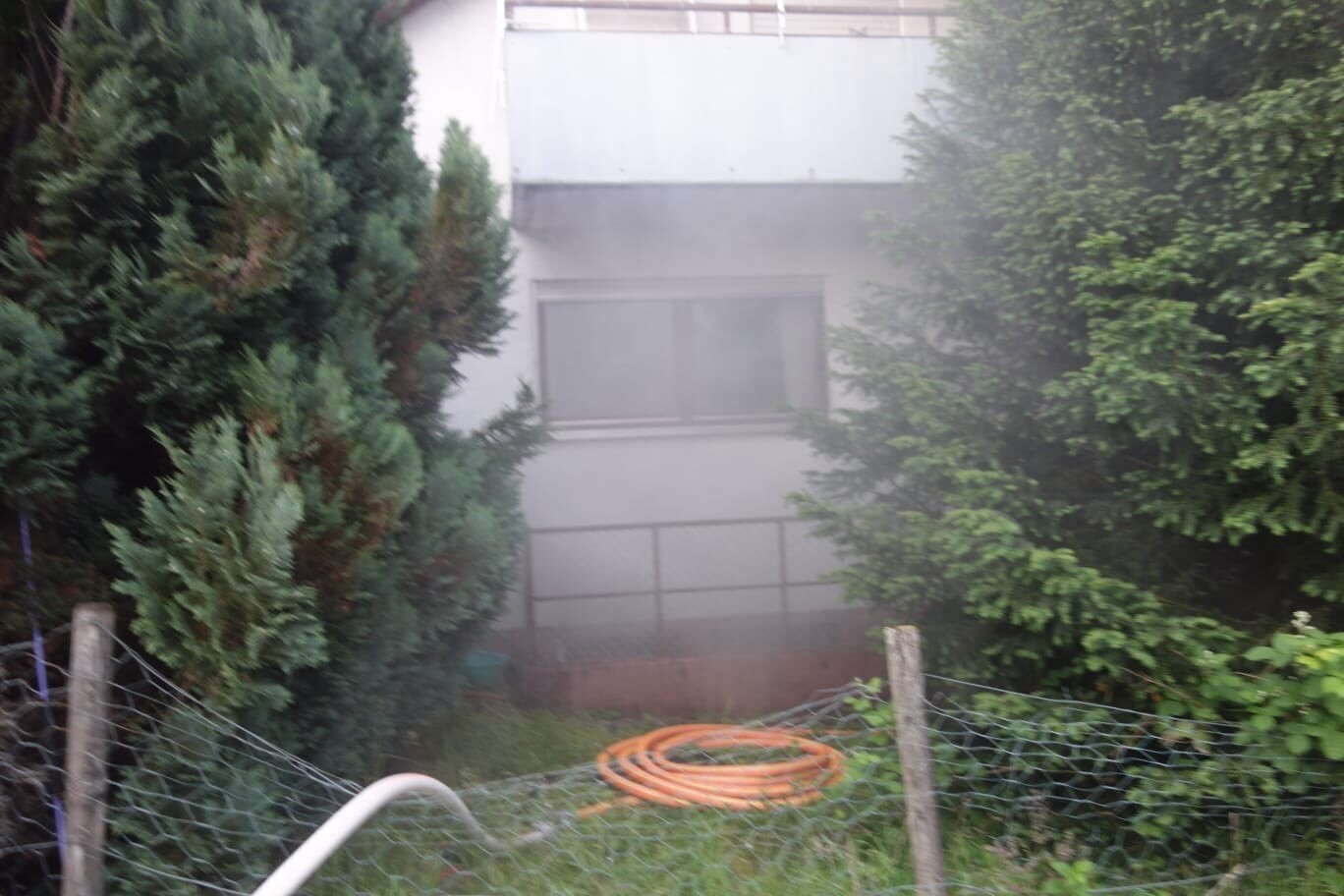Aus der Hauseingangstüre/ Treppenraum und aus den Kellerfenstern drang dichter Rauch aus dem Keller.