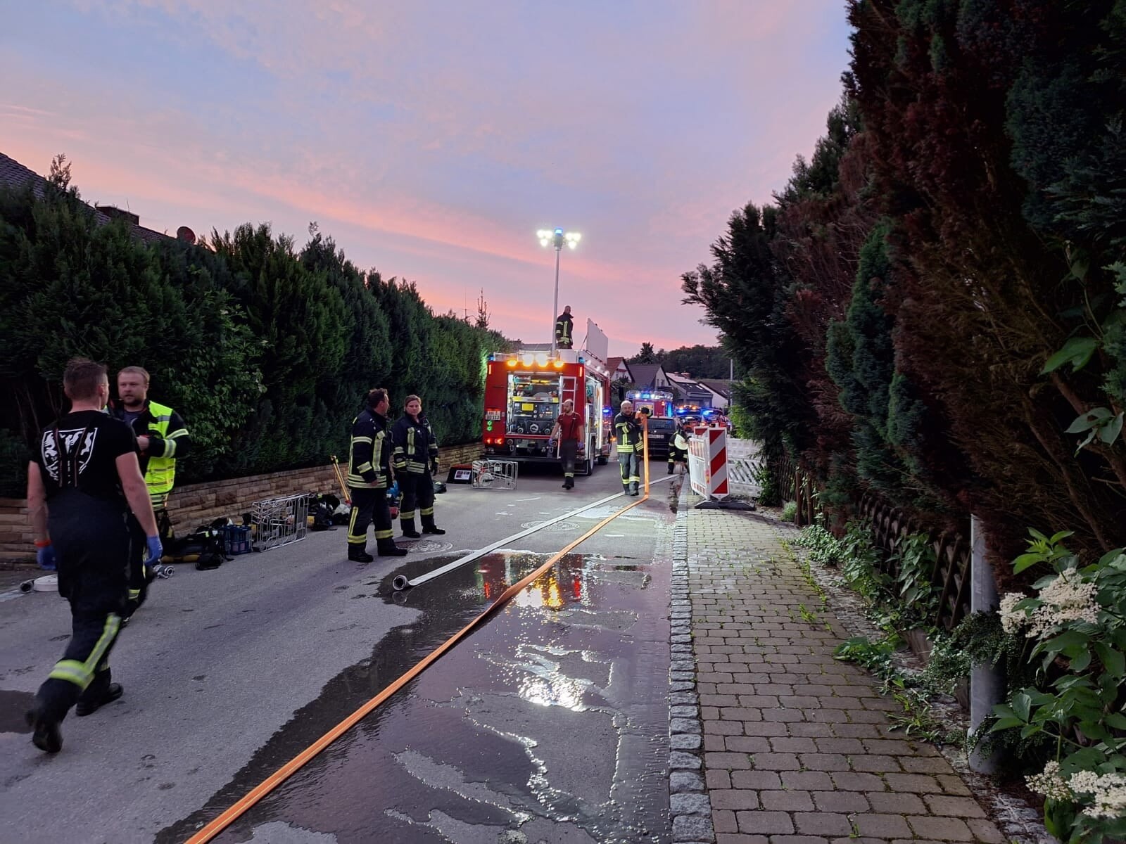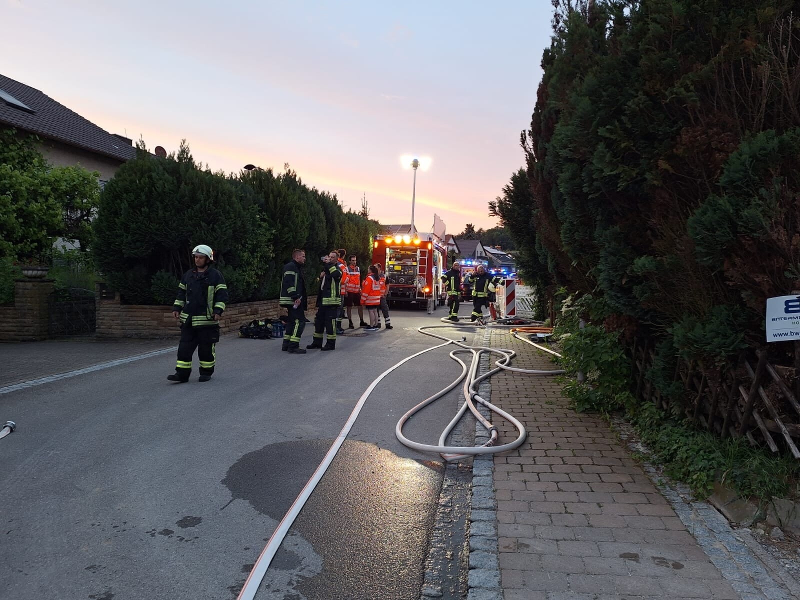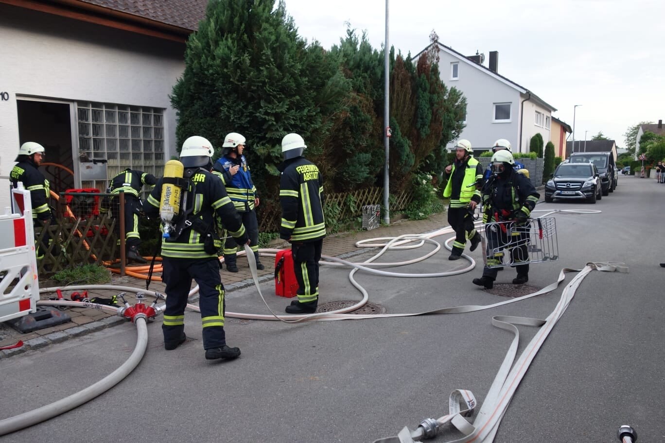Bei Eintreffen des Einsatzleiters wurde dieser bereits vom anwesenden Rettungsdienst empfangen und in die Lage eingewiesen. Die drei Hausbewohner wurden vom Rettungsdienst versorgt. Die Bewohner hatten auf Nachfrage des Einsatzleiters keine Gebäudeschlüssel dabei, die Hauseingangstüre war aber offen.