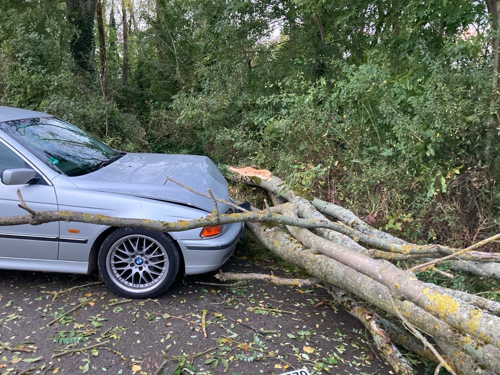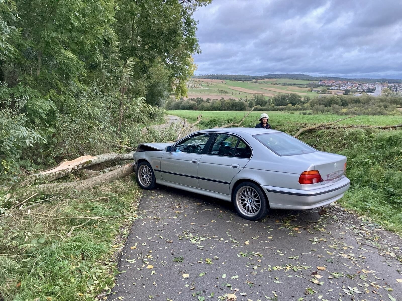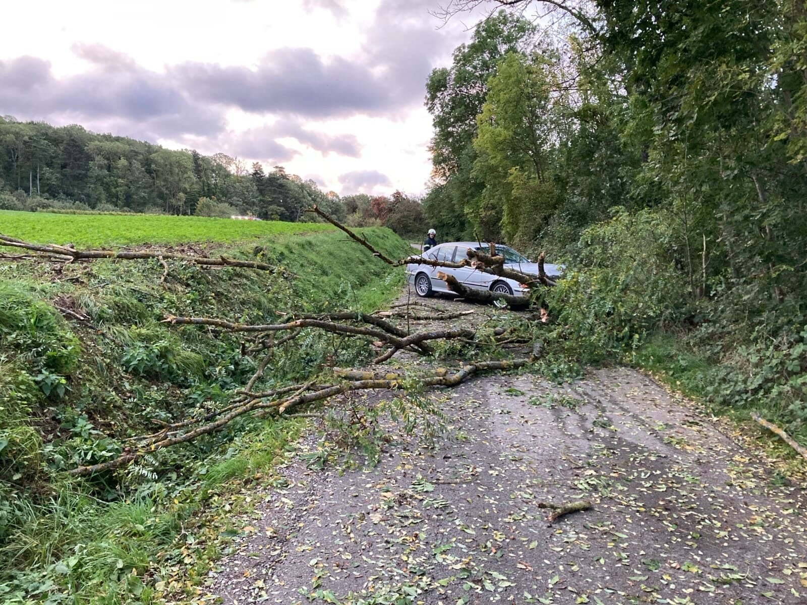 Eine erste Lageerkundung ergab, dass ein Fahrzeug gegen einen umgestürzten Baum gefahren ist. Das Fahrzeug war an der Front stark deformiert und nicht mehr fahrfähig. Der Fahrer hat ohne augenscheinliche Verletzungen das Fahrzeug eigenständig verlassen. Es sind keine Betriebsstoffe ausgelaufen.