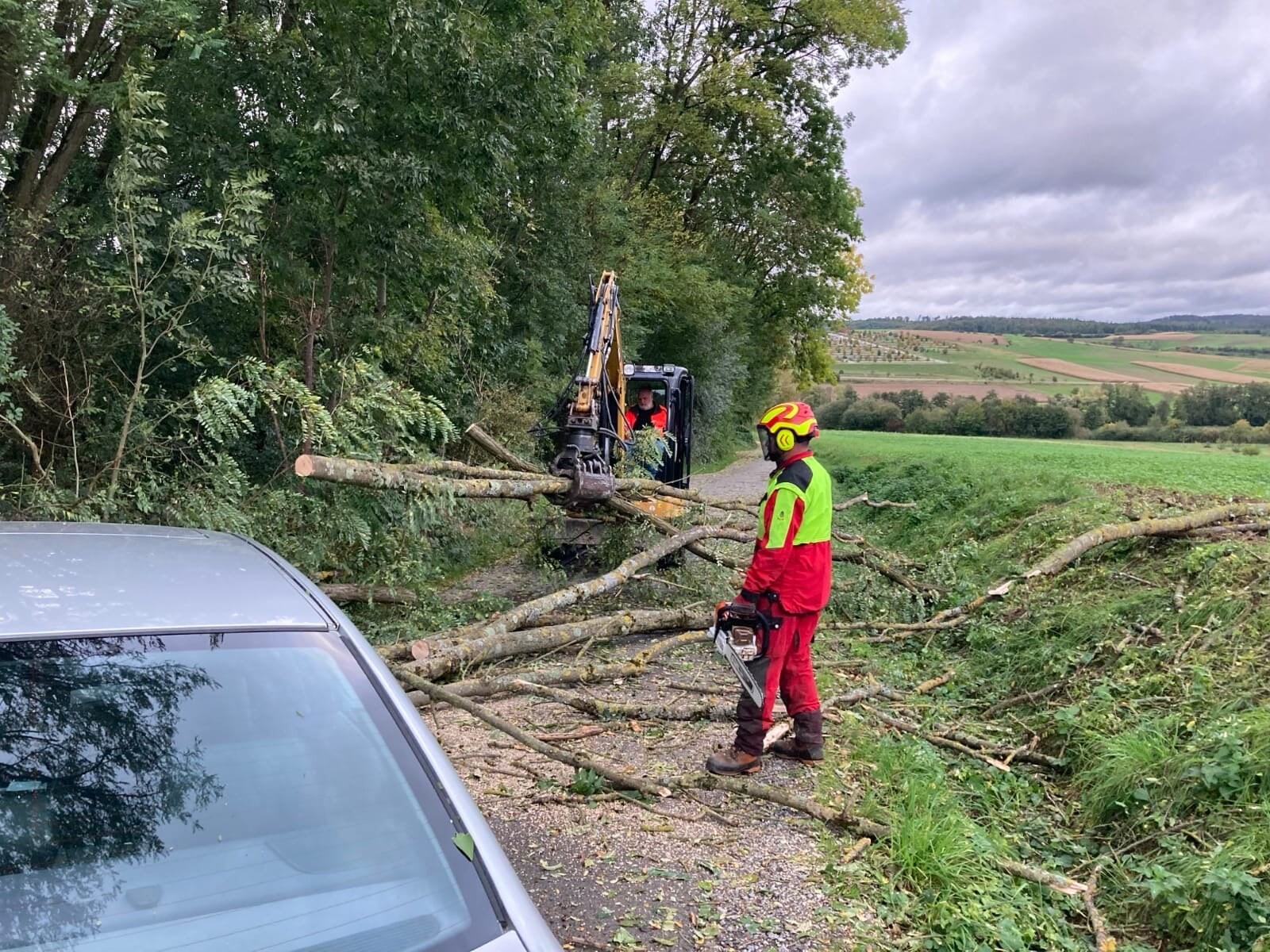 Die Feuerwehr Abstatt wurde am 10.10.2024 um 06:55 Uhr durch die Leitstelle zu einem umgestürzten Baum in die Zufahrtsstraße zur Burg Wildeck in Abstatt alarmiert.