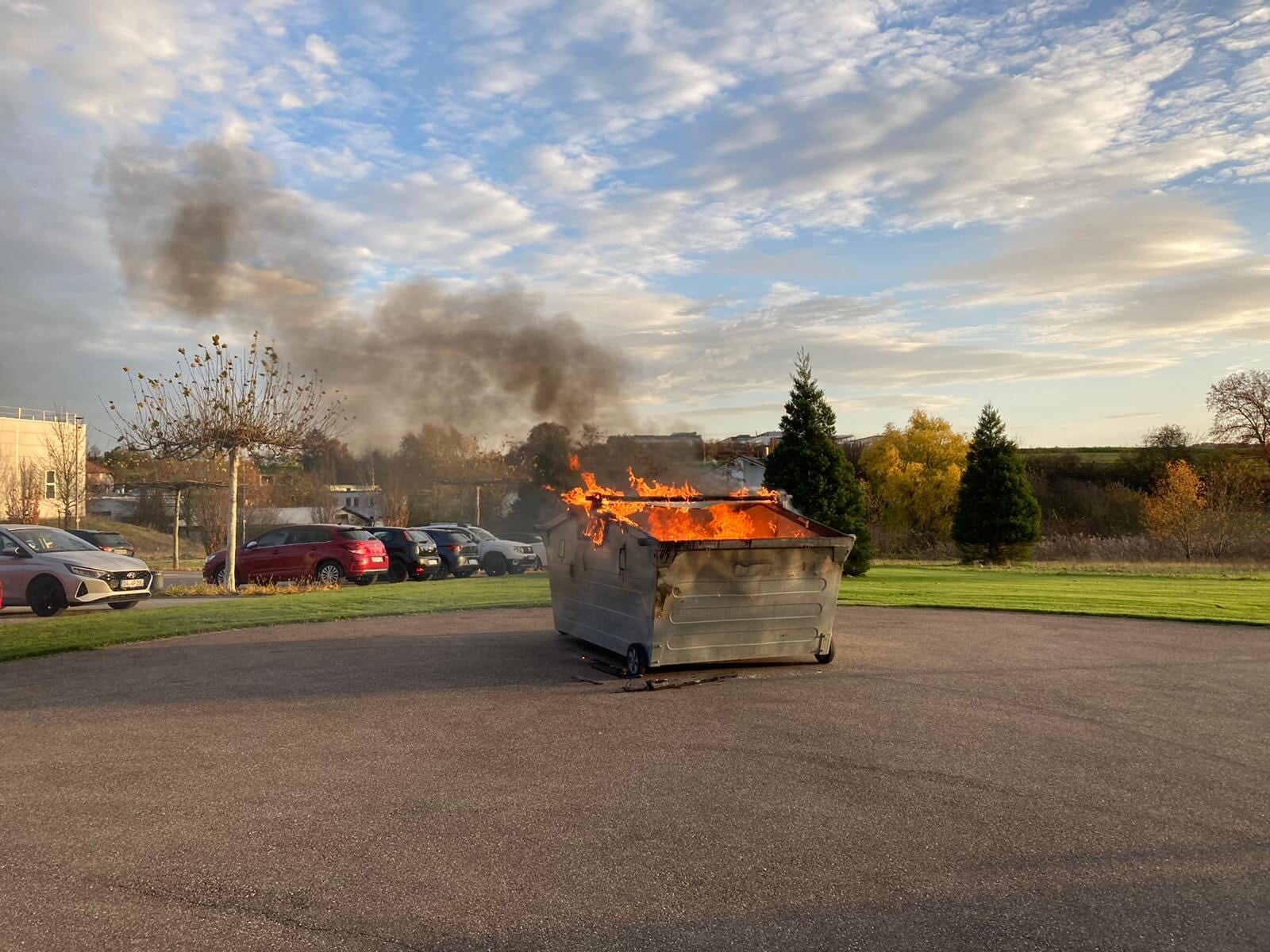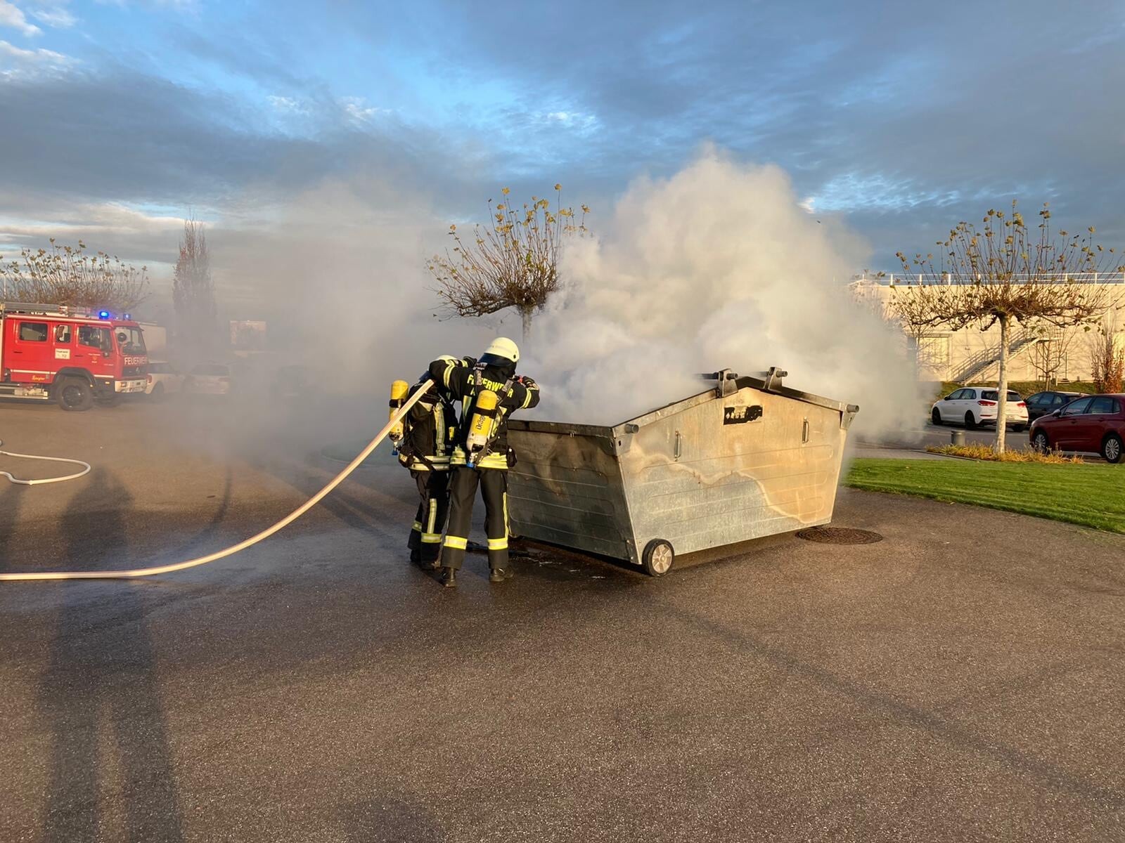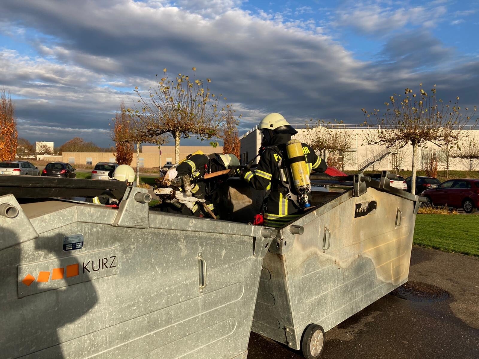 Eine Mitarbeiterin der Firma hat den Container bei beginnender Rauchentwicklung aus dem Entsorgungshof auf den Vorplatz geschoben und dadurch Schaden vom Gebäude abgewendet.