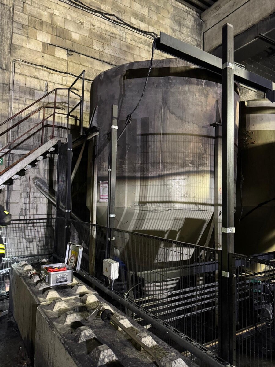 Es wurde nun aufwendig ein Zugang zum Silo geschaffen und untersucht wie das Granulat entnommen werden konnte. Das Granulat kann sich bereits durch statische Aufladung entzünden, daher schied das Schaffen einer Auslassöffnung durch Auftrennen aus. Das Auslassrohr wurde demontiert und anschließend wurde das Granulat mit Schuttmulden in einen Container entleert. Für diesen Vorgang waren abwechselnd immer 5 Personen der Feuerwehr Abstatt und Untergruppenbach gemeinsam unter Atemschutz im Einsatz.