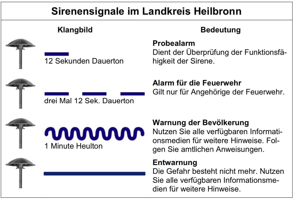 Nach Auslösung des Probesignals durch die Integrierte Leitstelle Heilbronn ertönt ein 12 Sekunden langer, gleichbleibend hoher Dauerton.
