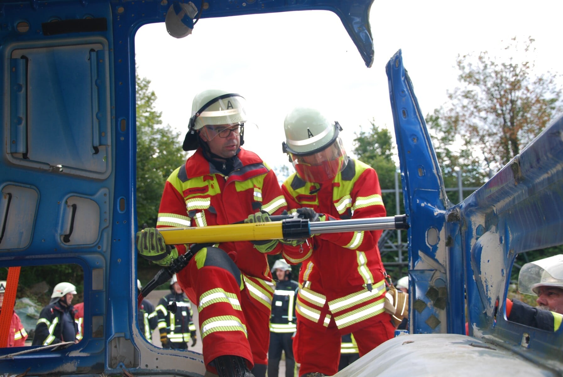 Besonders praxisnah gestaltete sich die Arbeit an der Rohkabine: Auf der einen Seite wurde der Einsatz des hydraulischen Rettungsgeräts trainiert, während auf der anderen Seite die Zweischnittmethode sowie der Einsatz von Ketten und maschinellen Zugeinrichtungen demonstriert wurden.